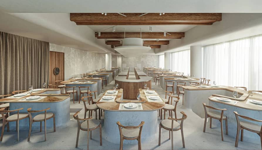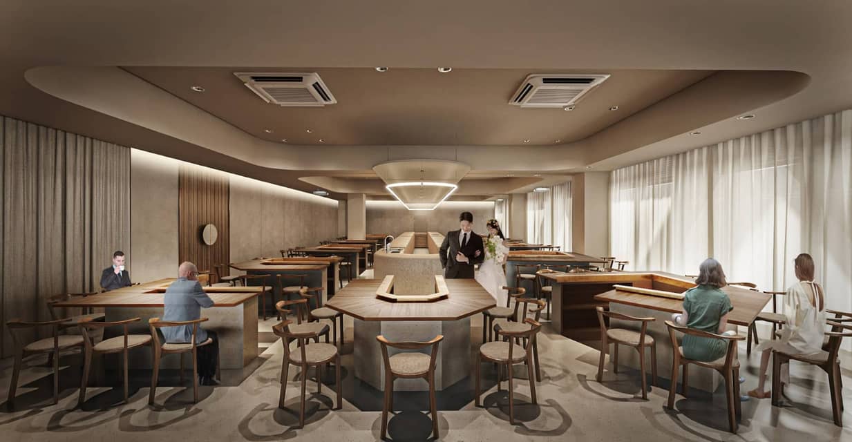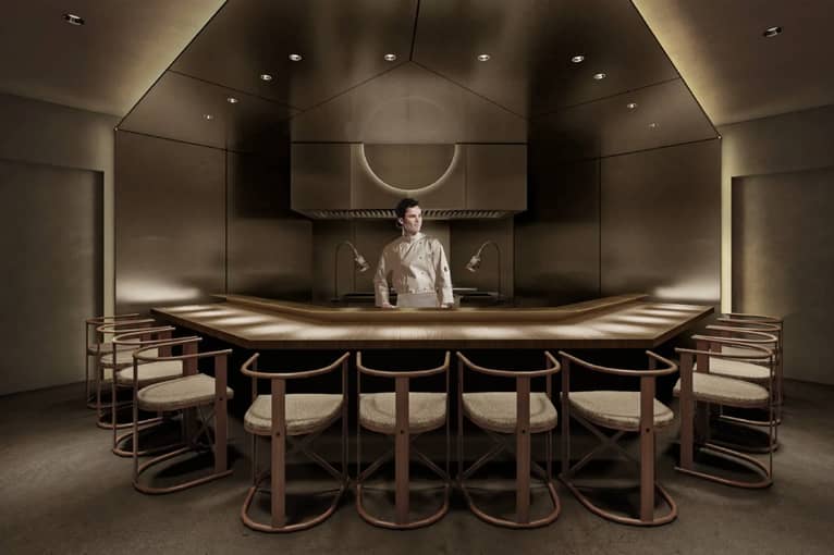 会場中央のセンターキッチンでは、仕上げの火入れや盛り付けをライブでご提供。シェフから直接料理説明があり、臨場感のある体験に。カウンター式テーブルでは、従来にはない新しいスタイルで、全ゲストをおもてなし。上座・下座の概念がなく「全席、特等席」となるレイアウト。